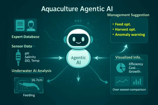西灣智慧科技研發 Aquaculture Agentic AI,結合 大語言模型(LLM)、檢索增強生成(RAG) 與 多代理智能(Agentic AI),專為白蝦養殖打造智慧決策引擎。系統整合專家知識、水質感測數據與水下AI影像辨識,能即時分析蝦群健康與環境變化,並生成易懂的管理建議。