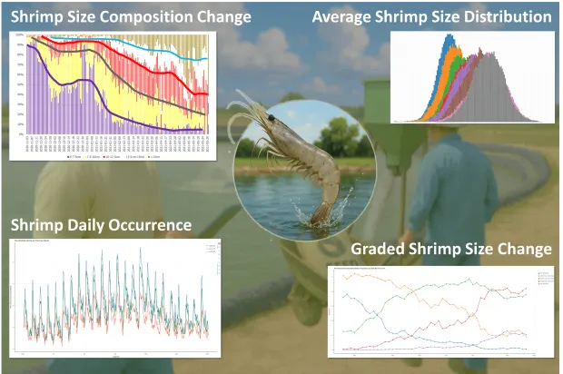 AI即時影像辨識系統將傳統人工觀察轉化為科學化數據分析。透過水下攝影裝置自動框選蝦隻個體,即時辨識數量、體長分布、群聚密度及活動狀態,並生成「攝食活動指標」評估蝦群健康與投餌反應。系統即時回傳數據至管理平台,提供清晰統計圖表協助精準決策。相較傳統料網抽樣,大幅提升數據代表性並降低人力成本與蝦隻受傷風險。長期數據累積建立完整成長曲線,支援成本效益評估與收成規劃,實現從「經驗管理」到「數據驅動決策」的智慧養殖轉型。